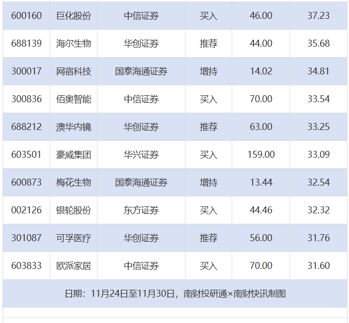 从券商推荐家数来看,11月24日至11月30日有238家上市公司得到券商推荐,其中广汽集团、梅花生物、方盛制药等获得2家券商推荐。