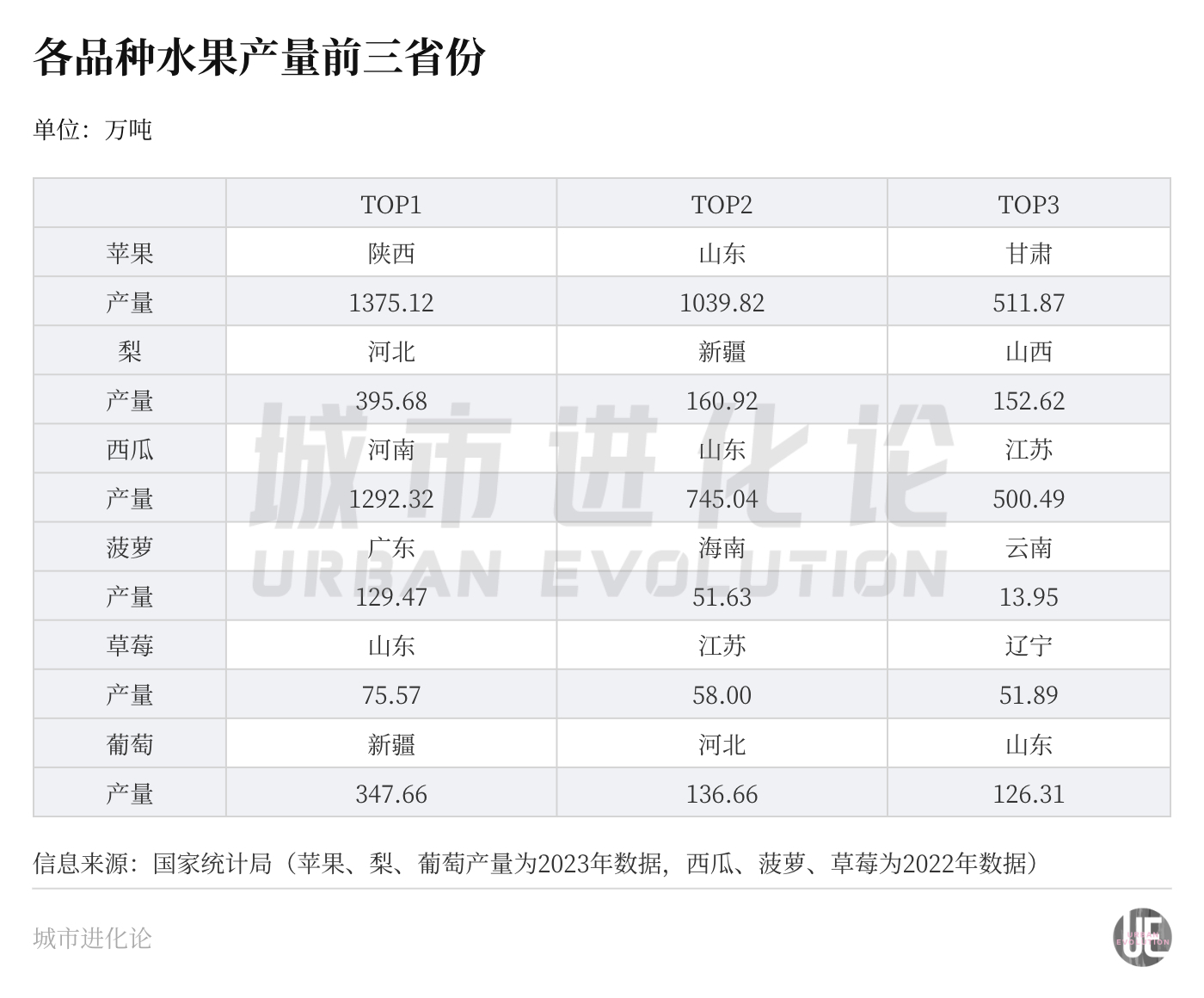 比如,苹果产量,陕西和山东占据前两位,洛川富士和烟台红富士“排面”十足;梨产量,拥有赵县雪花梨的河北和孕育出库尔勒香梨的新疆则无人能敌。还有河南的西瓜、广东的菠萝、山东的草莓、新疆的葡萄,每一种水果都代表了一种城市的味道,也串联起人们有关地区的记忆。