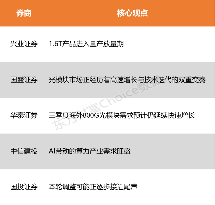 兴业证券表示,AI训练与推理网络带宽需求快速增长,1.6T产品进入量产放量期。国盛证券指出,在AI算力需求持续爆发的驱动下,光模块市场正经历着高速增长与技术迭代的双重变奏。技术领先、客户优质、产能全球化的光模块龙头企业将保持强劲的盈利能力和竞争优势。