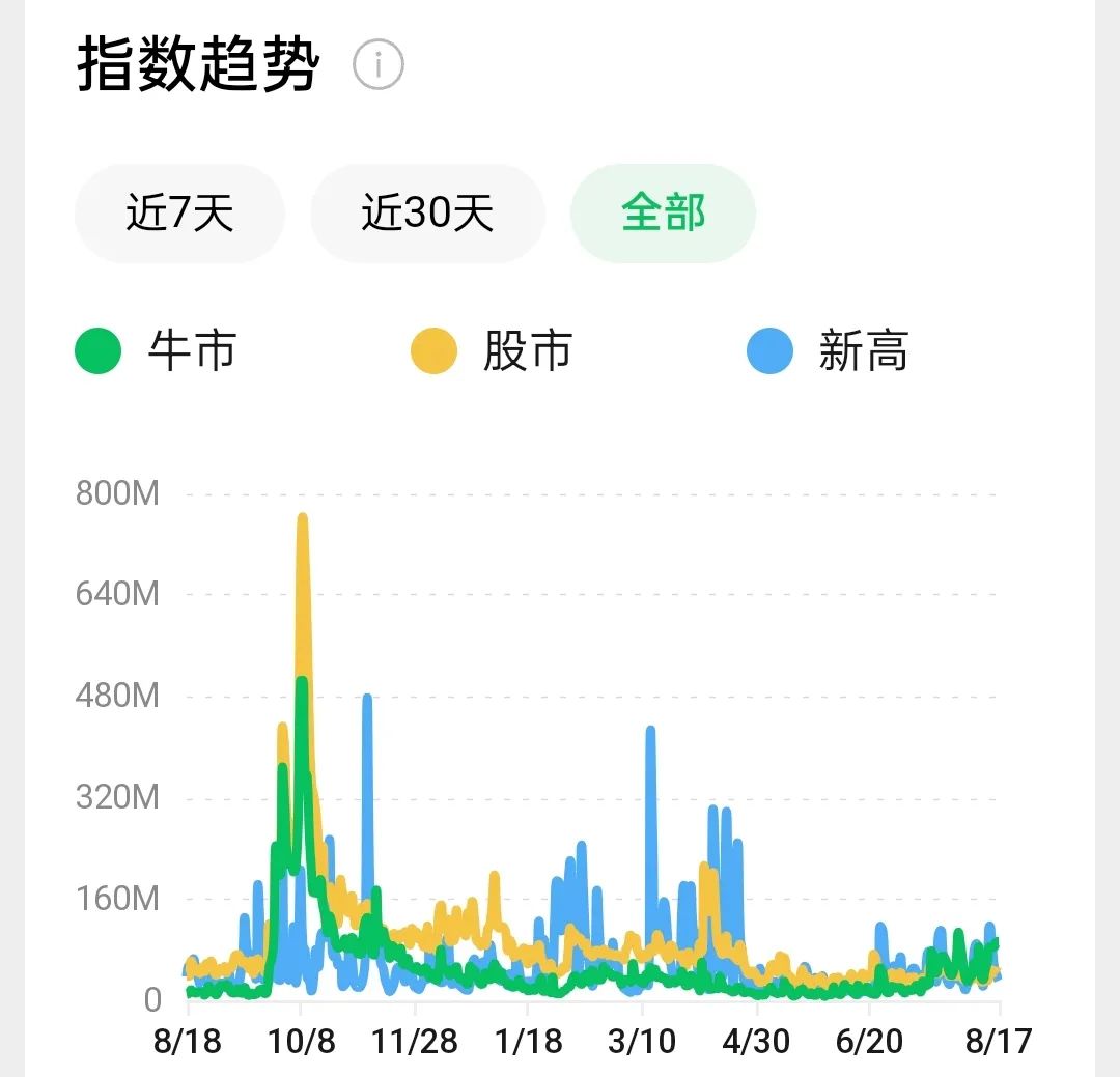 记者注意到,微信指数显示,“股市”“牛市”“新高”等关键词当前的搜索量远不及去年“9·24”前后,这也从侧面反映出市场或许尚未行至情绪高点。