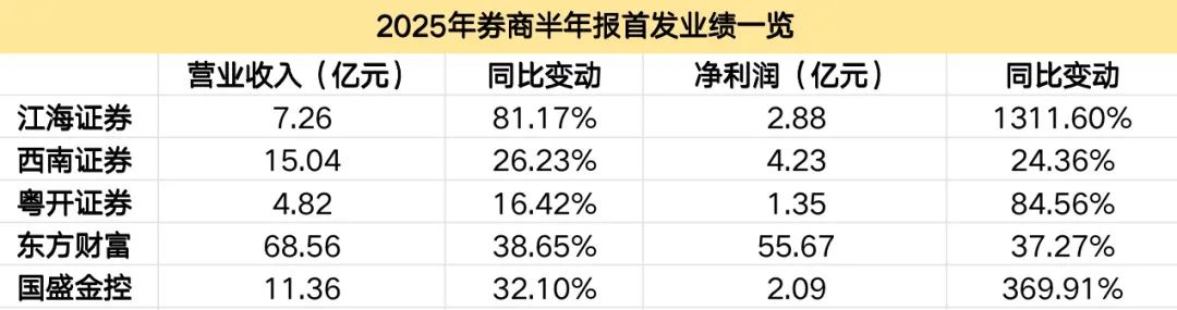 时至8月中旬,首批券商2025年半年报陆续披露。截至8月18日,已有国盛金控、东方财富、哈投股份、西南证券、粤开证券等5家券商及券商母公司公布半年度“成绩单”,上述5家券商均实现营收、净利双增长。其中,得益于较低基数,哈投股份子公司江海证券净利润同比大增1311.60%。